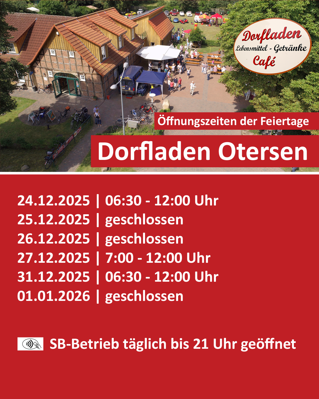 Der Dorfladen hat die Öffnungszeiten über die Feiertage 2025 / 2026 veröffentlicht. An allen Tagen ist der Dorfladen bis 21 Uhr im SB-Betrieb geöffnet.