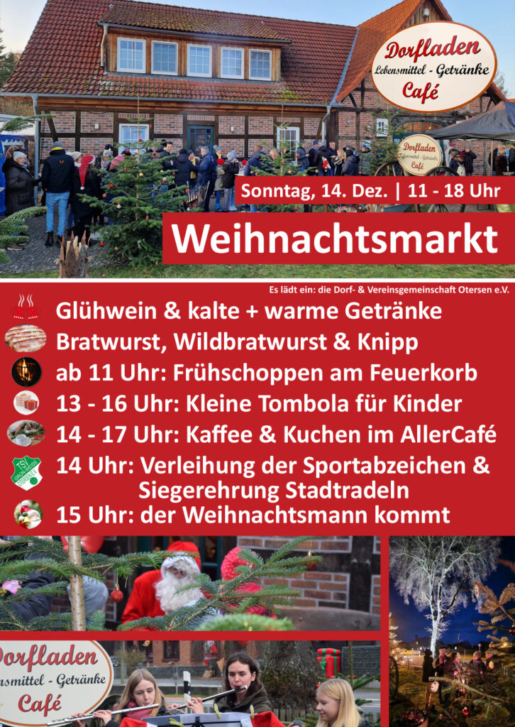 Die Dorf- und Vereinsgemeinschaft Otersen lädt am 3. Adventssonntag, 14. Dezember, herzlich zum kleinen Weihnachtsmarkt rund um den Dorfladen ein. Die Veranstaltung bietet eine wunderbare Gelegenheit, in gemütlicher Atmosphäre mit Nachbarn und Freunden zusammenzukommen, zu klönen und sich auf die Weihnachtszeit einzustimmen.