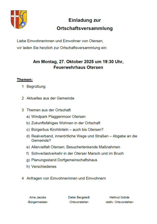 Die nächste Ortschaftsversammlung findet am Montag, den 27. Oktober um 19:30 Uhr im Feuerwehrhaus in Otersen statt. Neben den aktuellen Themen aus der Gemeinde, über die Bürgermeister Arne Jacobs berichten wird, stehen die Themen der Ortschaft im Mittelpunkt: Unter anderem geht es um die Themen Windpark Plaggenmoor, zukunftsfähiges Wohnen in der Ortschaft, den Bürgerbus Kirchlinteln, Realverband; innerörtliche Wege und Straßen – Abgaben an die Gemeinde, die Allervielfalt Otersen und besucherlenkende Maßnahmen, Schwerlastverkehr in der Oterser Marsch und im Bruch und den Planungsstand des Dorfgemeinschaftshauses.